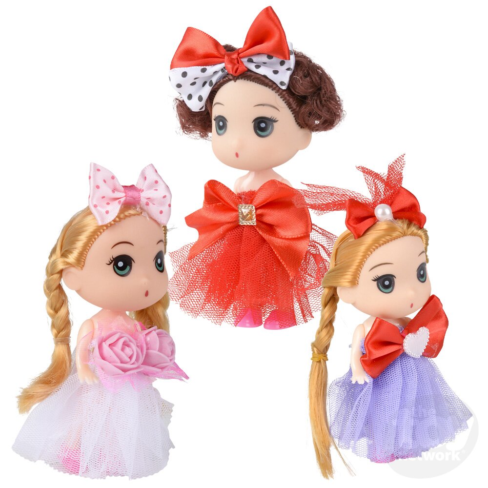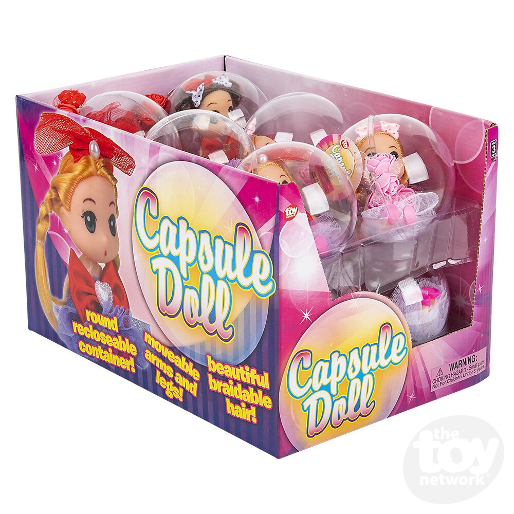 These 4" Doll in Capsule feature movable arms and legs and braidable hair. These plastic dolls come in a round capsule with assorted styles.