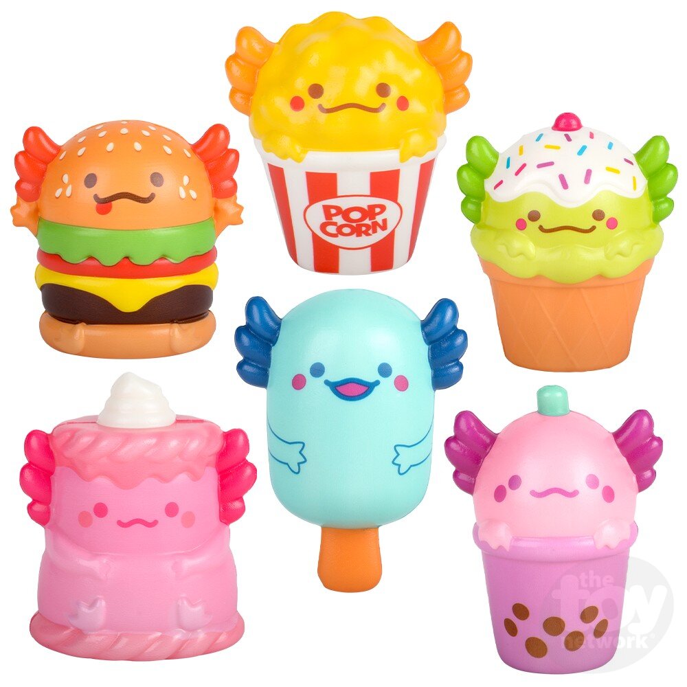 What a fun stress relief. The oh so popular animal friend, Axolotl in Foodie Form! Each piece of squishy, foamy food is topped with an axolotl head.