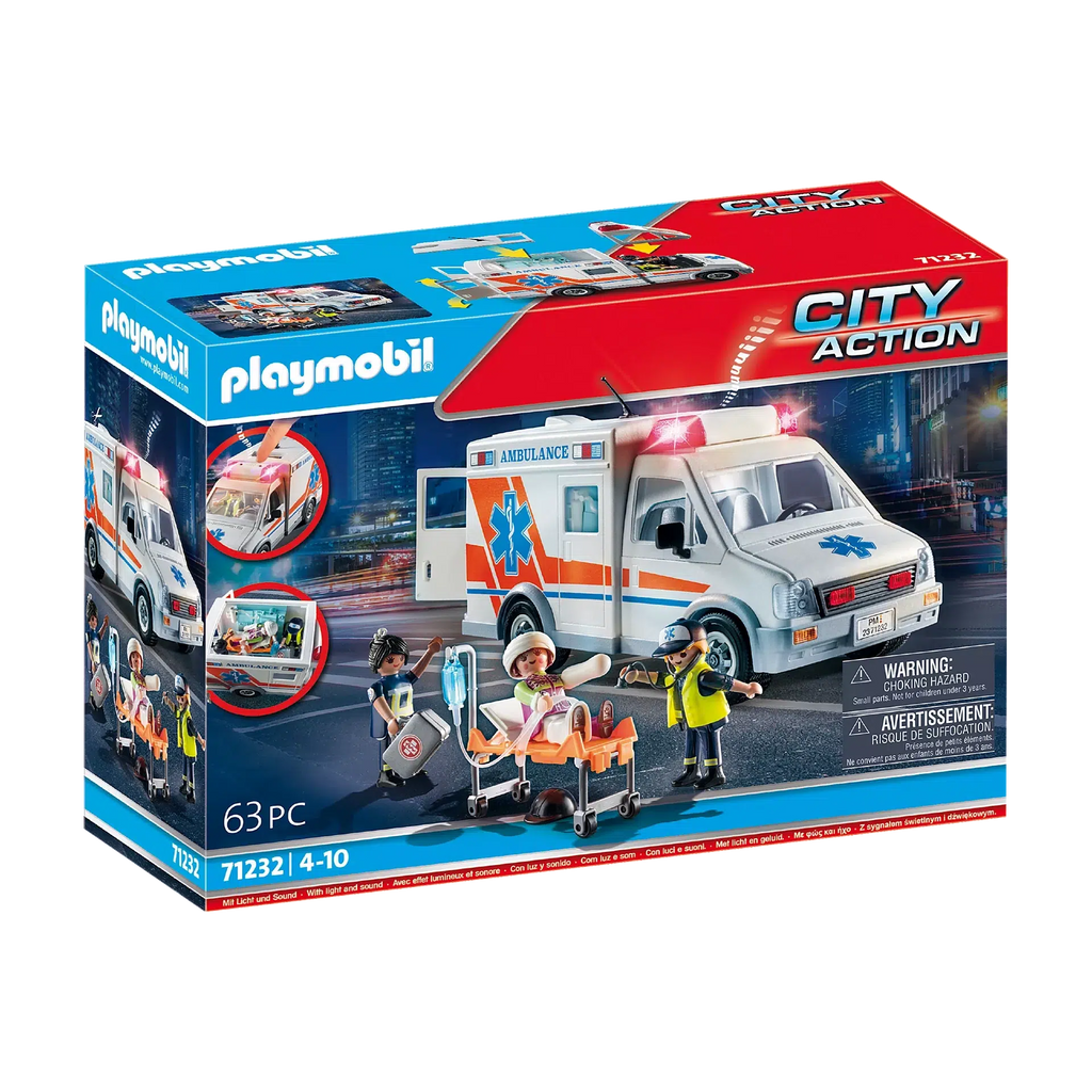 Grab your stethoscope and head to the rescue with the versatile Ambulance from PLAYMOBIL. This amazing set features an ambulance with siren sounds and opening back door with space for a stretcher. Easily access the ambulance's interior thanks to the removable roofs. The vehicle has various compartments for storing all the necessary medical equipment. Includes 3 PLAYMOBIL figures: a female and a male paramedic and a woman. Accessory elements include a stretcher, infusion stand, oxygen apparatus, operating instruments, stethoscope, plasters, head bandage and a first-aid kit. 1 x AAA battery required. Dimensions: 11.2 x 4.7 x 5.1 in (LxWxH) (without antenna) Recommended for ages four to ten years. Warning. Choking Hazard. Small parts. Not for children under 3 years.