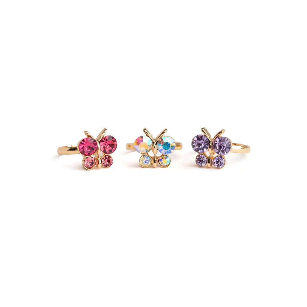Bring on the sparkle and shine with our beautiful Boutique Butterfly Gem Rings. Each ring in this 3-piece set features a shimmery jewel-toned butterfly design on a gold-coloured band sized perfectly for little fingers.