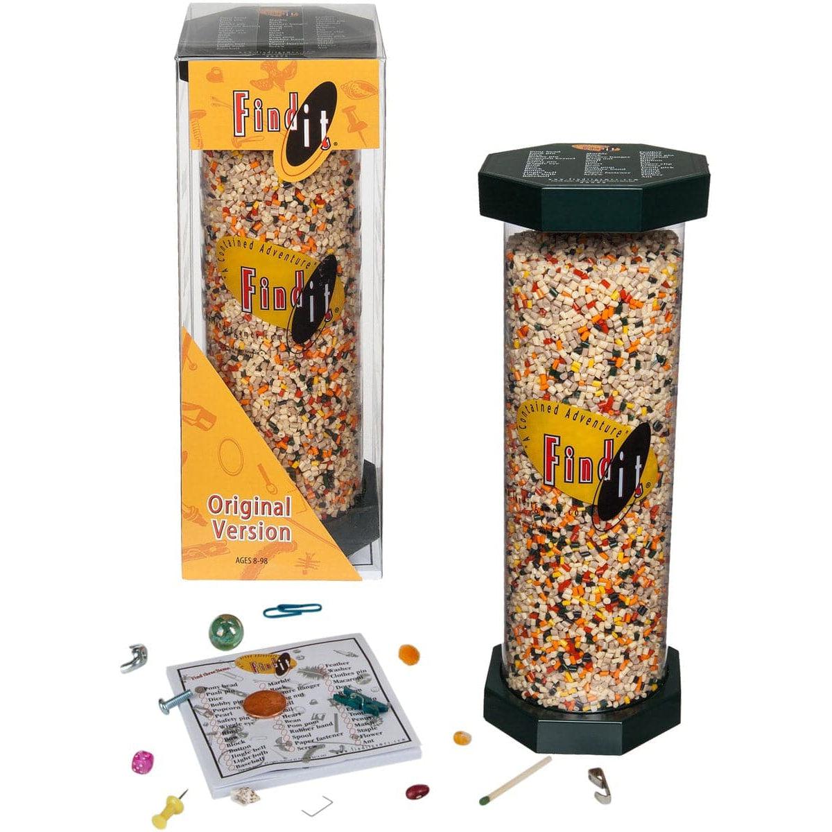 Find It® “Original Version” has natural colored pellets with 40+ hidden items. The plastic ends are coordinated forest green color. The items are smaller and are geared to teens and older. A beautiful game to leave out on the coffee table, office or waiting room. The items to find are things such as a wing nut, popcorn kernel, light bulb, bell, staple, and the elusive penny.