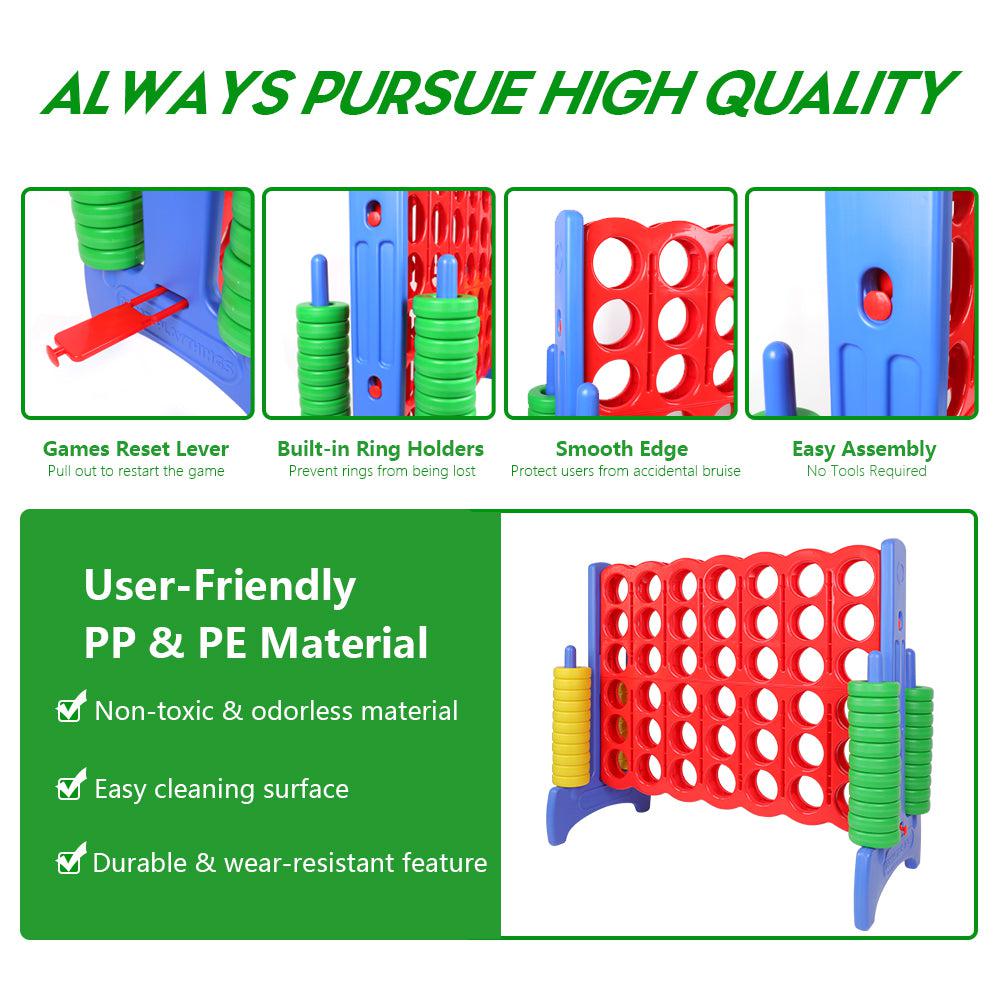 Our product made of carefully selected materials, the Giant Four in a Row Connect Game set is very durable and safe. The pieces are large and easy to handle. Premium PE and PP materials can provide you with a quality product that will last. The edges are very smooth to ensure players will not be scratched while playing and can have lots of fun. - DURABLE
