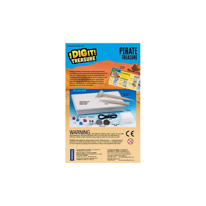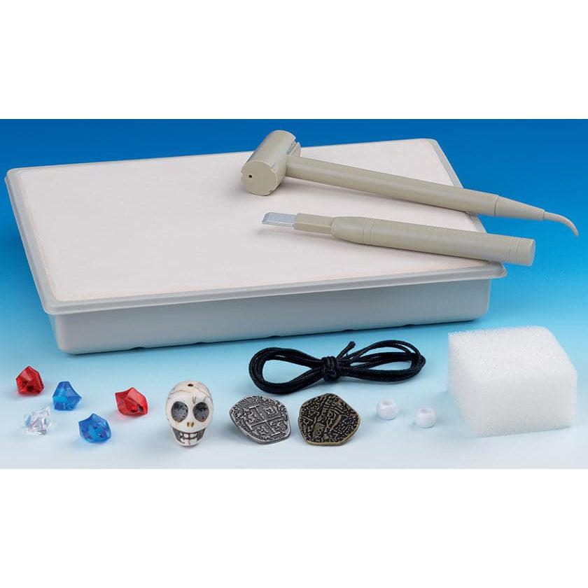 Would you like to know how archaeologists find and dig up pirate treasures buried in the ground? In this kit, a replica pirate treasure is waiting to be excavated from a plaster block. With a hammer and chisel, you can unearth metal coins, gemstones (plastic), beads (plastic), and a large stone skull bead. Tie knots in a cord to fashion a pirate’s keychain for the skull and beads.