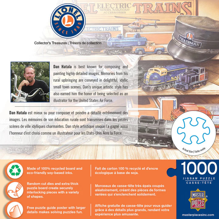 These MasterPieces Lionel Trains 19.25" x 26.75" 1000pc Puzzles are sure to become family favorites. Most collectible then ever before the Classic Lionel trains bring back fond memories of family times. Train collectors are sure to love the incredible details and accurate renditions of these American classics. To reduce their impact on our environment, the chipboard used in these puzzles is made of 100% recycled material.