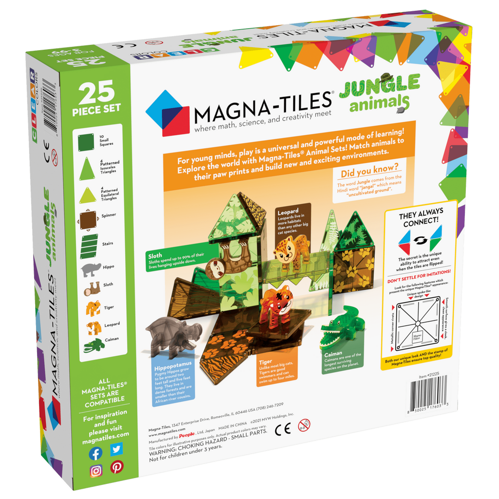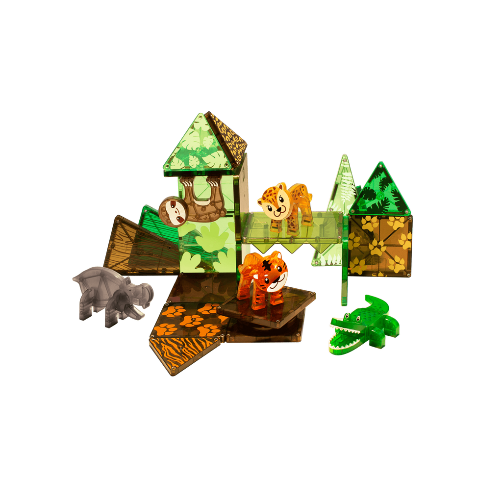 Go wild with the Magna-Tiles® Jungle Animals 25-Piece Set. From erecting new environments to creating exciting animal adventures, young animal lovers can find endless opportunities to explore without leaving the playroom. Using the magnetic tiles that mirror vibrant greenery and wildlife unique to the tropical forest, children can roar with excitement as they learn about the creatures through engaging, hands-on play.
