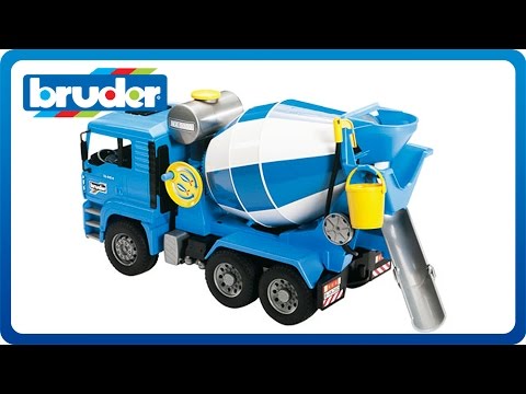 This MAN Cement Mixer by Bruder has a hand wheel that turns the drum and actually moves its contents. The Drum empties through the chute. The chute is adjustable and water actually drains out of the water tank through the hose of this cement truck. It has a removable bucket, and soft rubber tires with real tread. The Cab of this cement mixer actually lifts forward to reveal the engine.