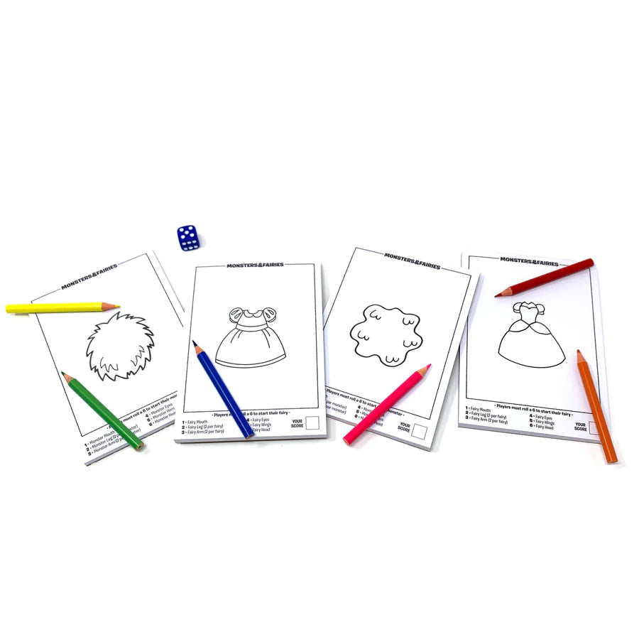 With Monsters & Fairies, kids use their imagination and creativity to create their favorite creatures. Roll the dice and draw the body part that corresponds to that number.